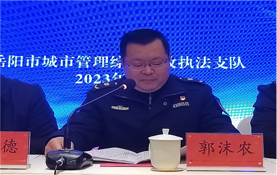市城管局党组成员、副局长袁本德出席会议并讲话。支队党委书记、支队长郭沫农代表支队党委作2023年工作报告,党委副书记、副支队长徐畅宣读2022年度先进集体和先进个人表彰通报。会议由支队党委专职副书记彭运学主持。局法规科科长张健,支队党委班子成员、全体在职干部职工及协管员,市公安城管大队相关人员近110人参加会议。会前,与会人员集体观看了廉政教育警示片《忠诚与背叛》。