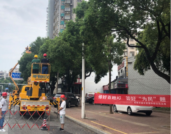 因建设时间早,我市城区多处主次干道路灯逐渐出现树荫遮光、光衰严重、照度不够、运行不稳定等问题,为保障民生、及时解决市民诉求,市城市管理和综合执法局“城市照明人”拿出为民便民的实招硬招,通过前期摸底、现场查勘,将王家河大道东、洞庭大道、琵琶王立交桥辅道等8处主次干道900余盏路灯列入2023年绿色照明改造计划,自2023年6月14日开始实施,目前正紧锣密鼓进行中。