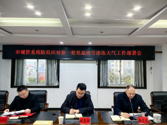 2月21日上午,市城管局组织召开防范应对新一轮低温雨雪冰冻天气工作部署会,会议由党组成员、副局长刘其汉主持,党组成员、副局长杨思权、柴石球出席,局属各单位、局机关相关科室负责人,岳阳楼区住建局、城管局、环卫中心、城市管理督查考评中心,经开区城管局,南湖新区城管局、城管事务中心相关负责人参加会议。