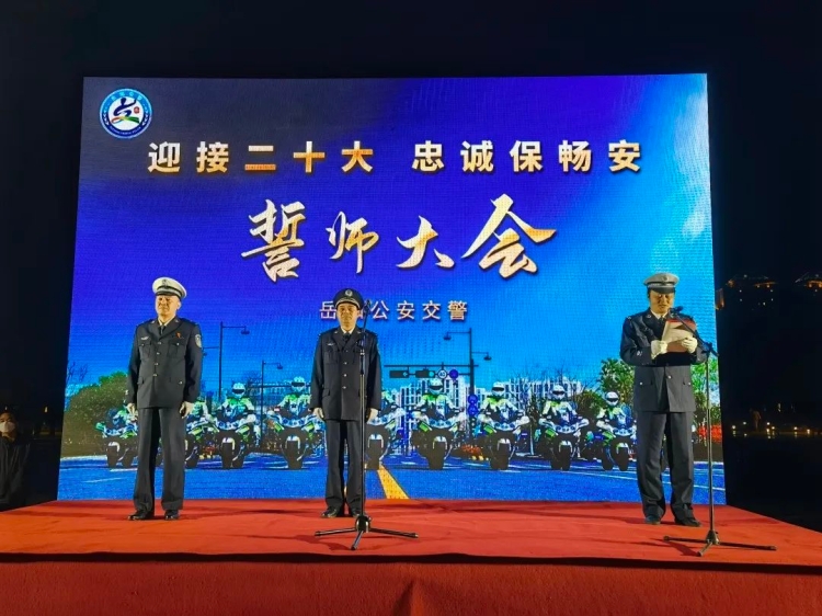 4月18日晚,岳阳市公安局交通警察支队在南湖广场举办以“迎接二十大 忠诚保畅安”主题誓师大会,支队党委班子成员、支队机关、直属大队民辅警参加此次活动。市公安局党委委员、副局长欧阳德儒宣布全市公安交警“迎接二十大 忠诚保畅安”行动启动,交警支队党委书记、支队长傅学文主持大会并发布动员令。