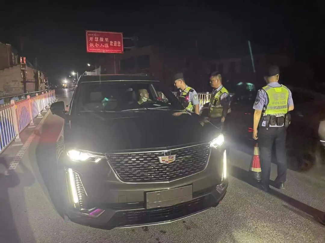 图为湘阴公安在重要路段设卡严查车辆无证驾驶、酒驾等违法行为