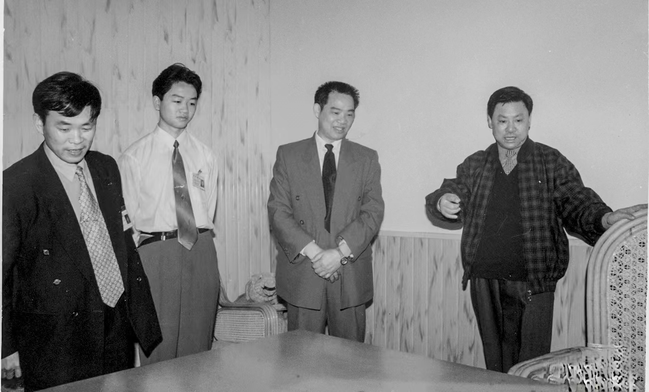 1997年4月11日,湖南省委副书记储波(右一)在汨罗市委书记葛送培(右二)陪同下,在湖南天子傢俬股份有限公司考察。
