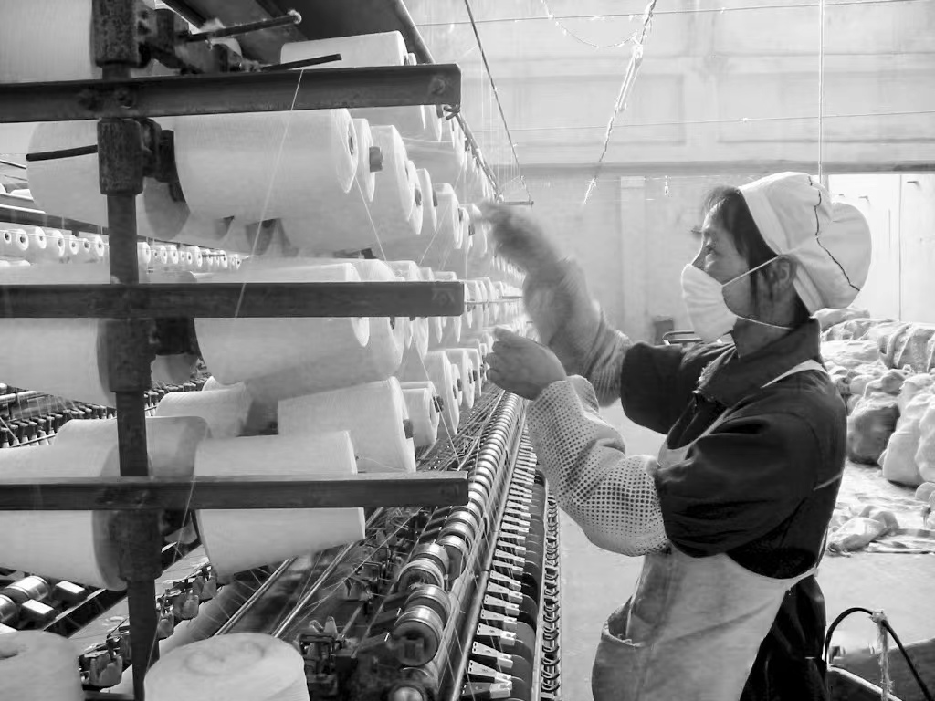 2002年6月,弼时棉织厂,工人在生产线上工作。