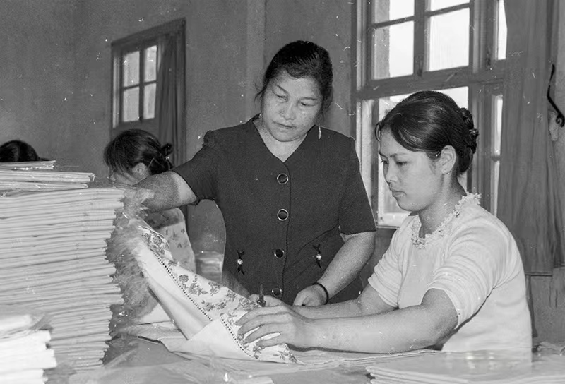 2001年6月,川山宏图绣品厂,厂长吴赛华(左)对产品进行抽样检查。