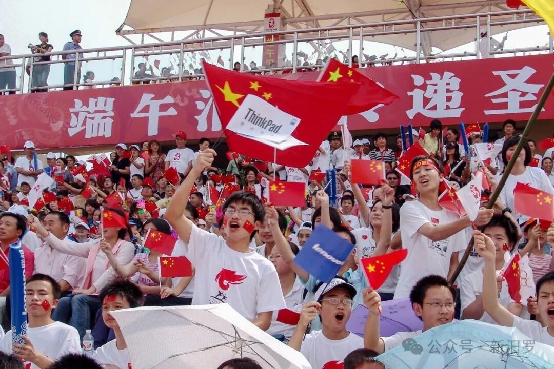 现场观众挥舞五星红旗与奥运会会旗,为北京奥运呐喊助威。黄松柏摄