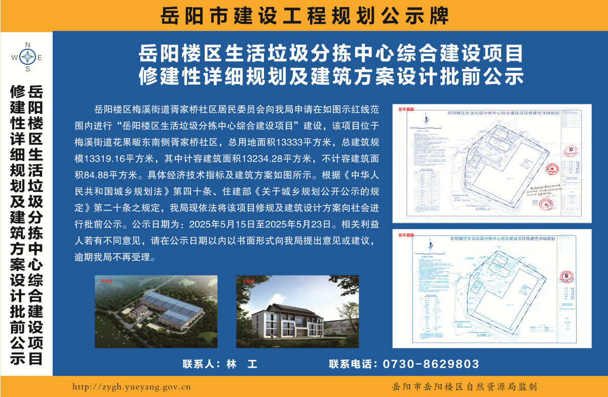 岳阳楼区生活垃圾分拣中心综合建设项目修建性详细规划及建筑方案批前公示