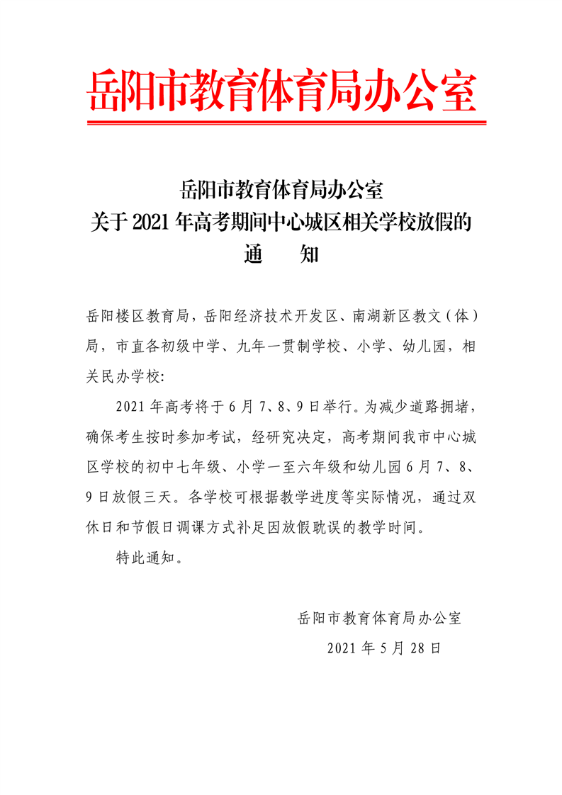 岳阳市教育体育局办公室关于2021年高考期间中心城区相关学校放假的通知