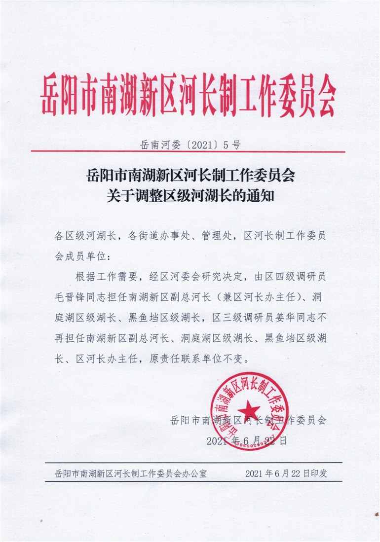 岳阳市南湖新区河长制工作委员会关于调整区级河湖长的通知