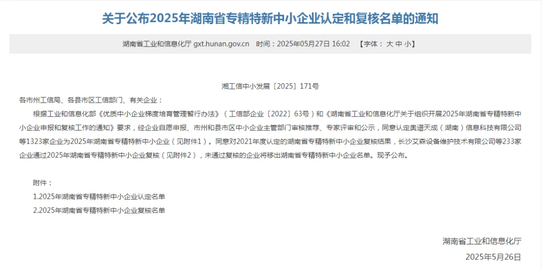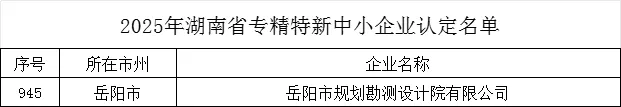 近日,湖南省工业和信息化厅正式发布2025年湖南省专精特新中小企业认定名单,市规划院公司凭借专业领域的深厚积淀、持续的创新能力及突出的区域贡献成功入选。这一殊荣不仅是对院公司综合实力的肯定,更标志着企业在专业化、精细化、特色化、新颖化发展道路上迈出坚实一步。