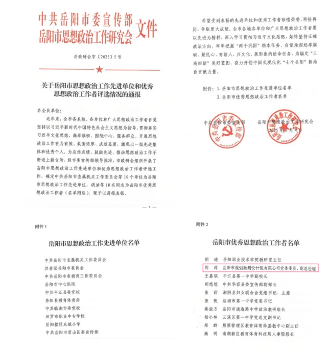 6月5日,岳阳市思想政治工作研究会第十五次会员代表大会顺利召开,市委常委、宣传部部长刘启峰出席并讲话,会上通报了《关于岳阳市思想政治工作先进单位和优秀思想政治工作者评选情况的通报》。经市国资委党委研究推荐,市规划院公司党委委员、副总经理周涔荣获“岳阳市优秀思想政治工作工作者”称号,系我市经济工作领域唯一。