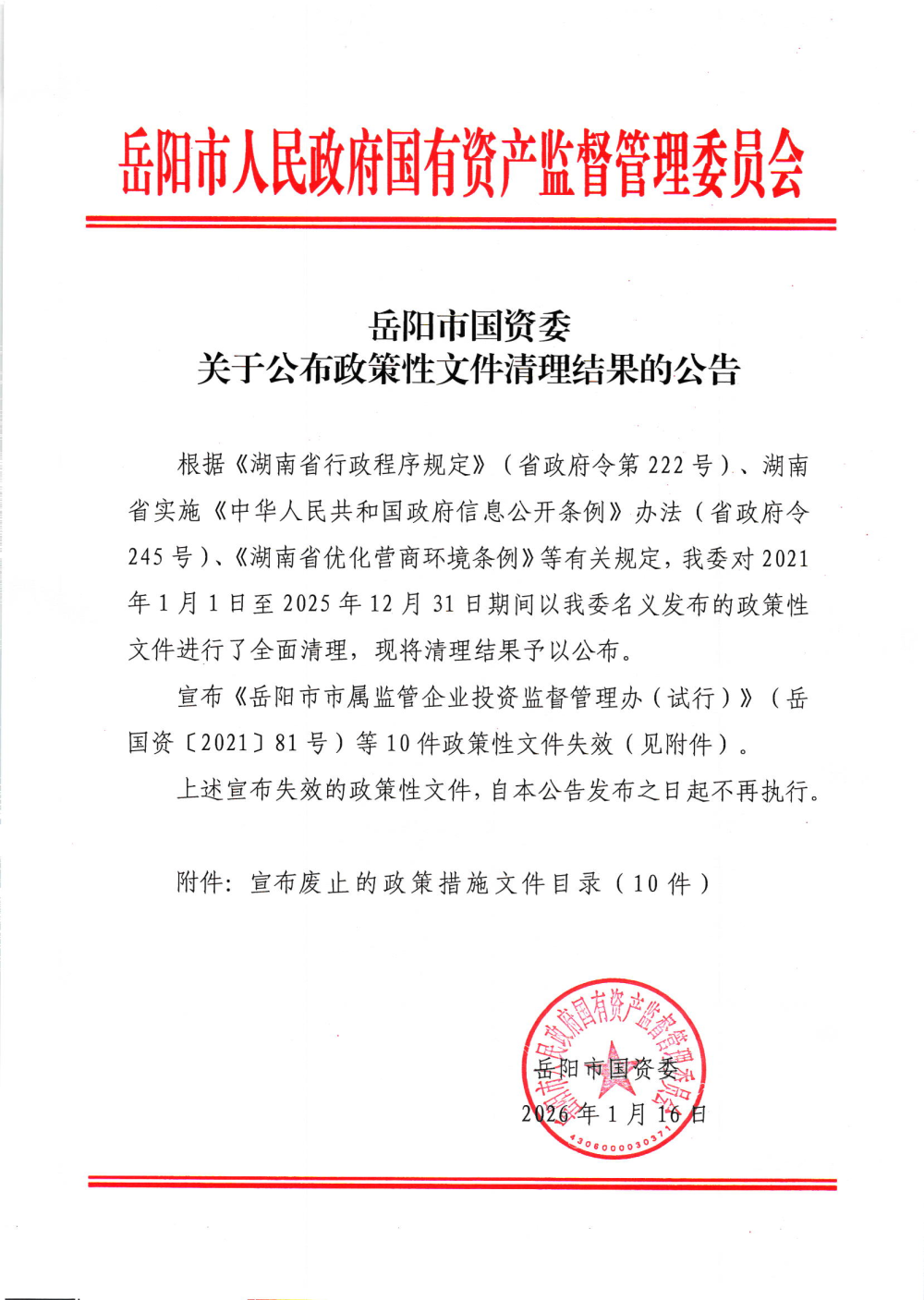 岳阳市国资委关于公布政策性文件清理结果的公告