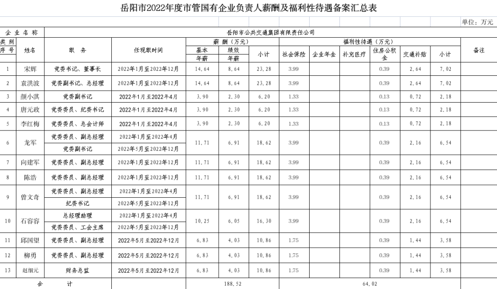 岳阳市2022年度市管国有企业负责人薪酬及福利性待遇备案汇总表