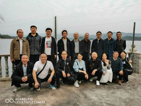 图为机关领导职工在铁山水库边合影