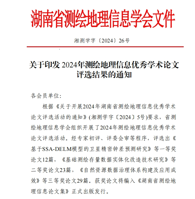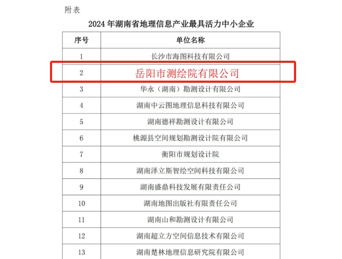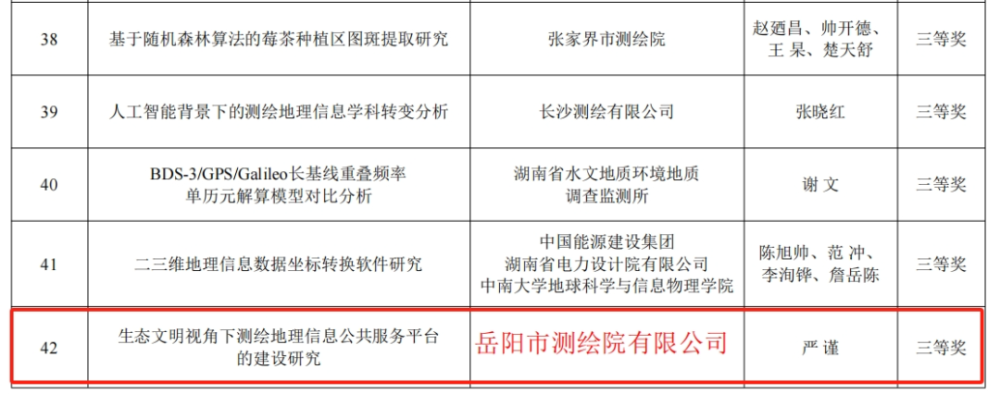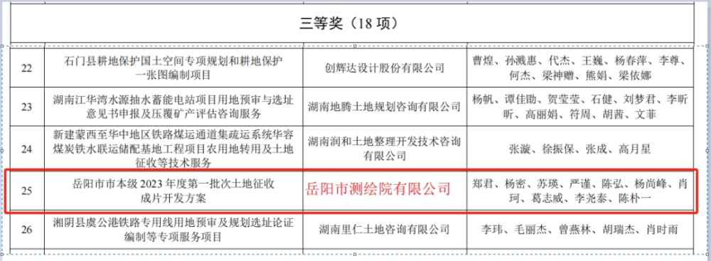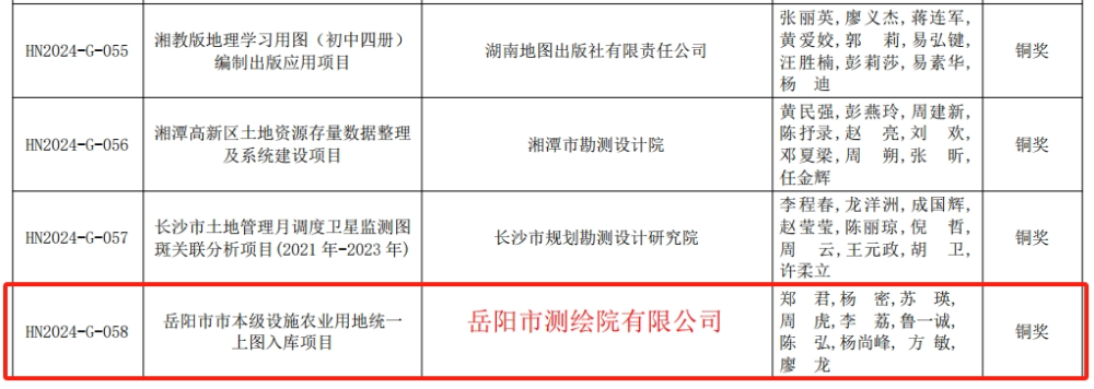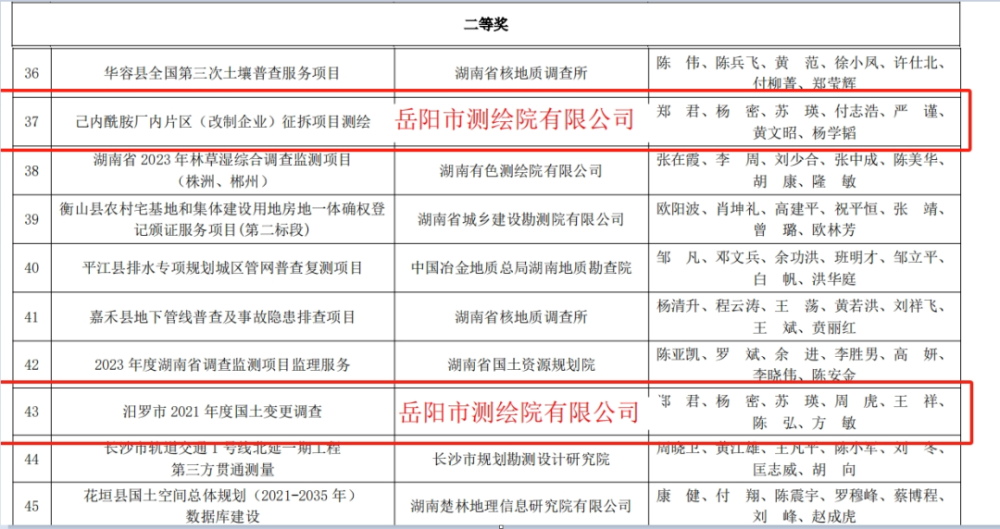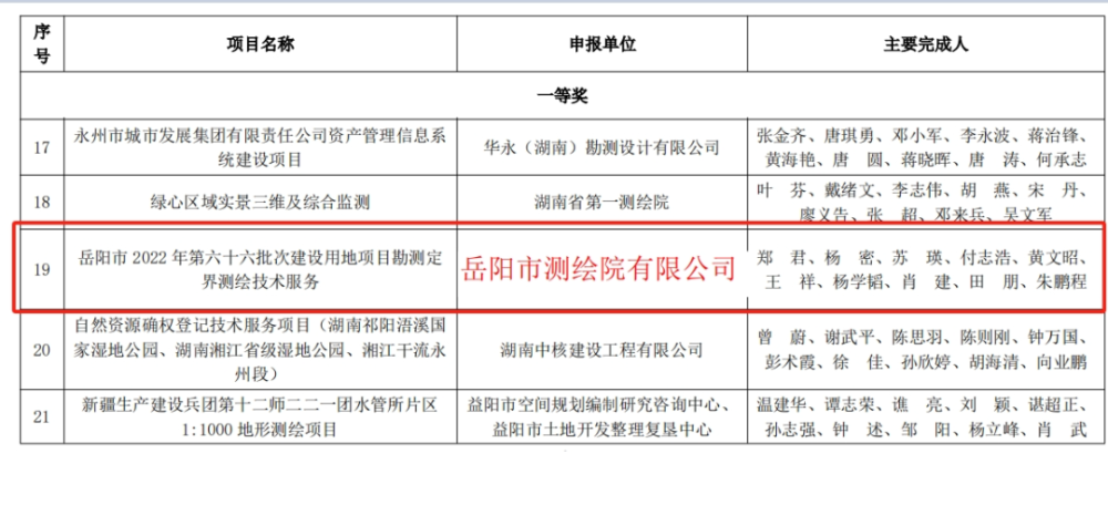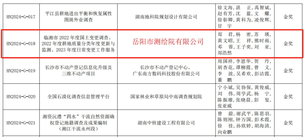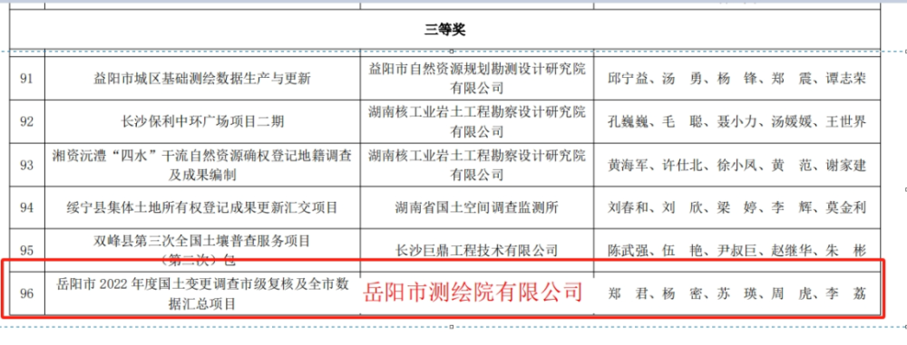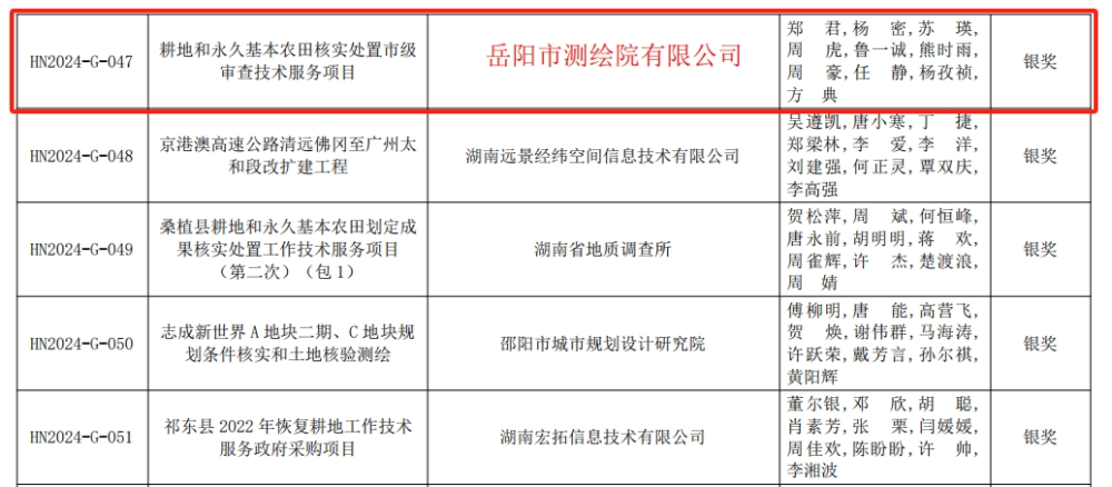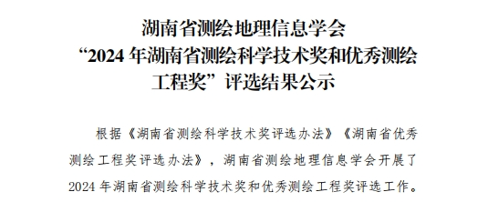 10月25日,湖南省测绘地理信息学会公布了《湖南省测绘地理信息学会“2024年湖南省测绘科学技术奖和优秀测绘工程奖”评选结果公示》,我司承担的“岳阳市2022年第六十六批次建设用地项目勘测定界测绘技术服务”项目荣获2024年湖南省优秀测绘工程奖一等奖;承担的“己内酰胺厂内片区(改制企业)征拆项目测绘”、“汨罗市2021年度国土变更调查”项目荣获优秀测绘工程奖二等奖;承担的“岳阳市2022年度国土变更调查市级复核及全市数据汇总项目”荣获优秀测绘工程奖三等奖。