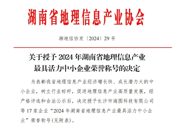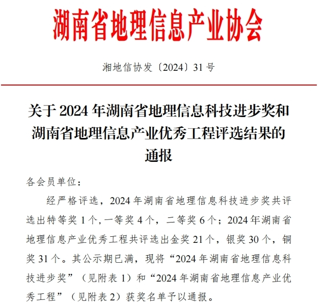 10月21日,湖南省地理信息产业协会公布了《关于授予2024年湖南省地理信息产业最具活力中小企业荣誉称号的决定》,我司荣获2024年湖南省地理信息产业最具活力中小企业奖。28日,协会公布了《关于2024年湖南省地理信息科技进步奖和湖南省地理信息产业优秀工程评选结果的通报》,我司承担的“临湘市2022年度国土变更调查、2022年度耕地质量分类年度更新与监测、2023年度日常变更工作服务”项目荣获2024年湖南省地理信息产业优秀工程金奖;承担的“耕地和永久基本农田核实处置市级审查技术服务项目”荣获优秀工程银奖;承担的“岳阳市市本级设施农业用地统一上图入库项目”荣获优秀工程铜奖。