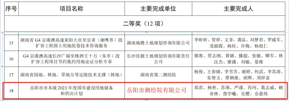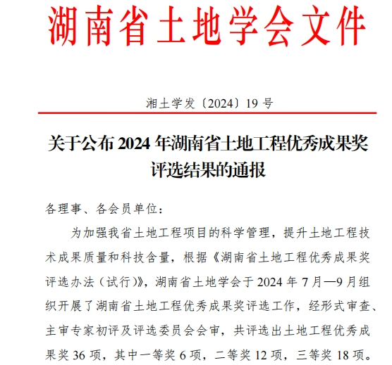 10月15日,根据湖南省土地学会公布了《关于公布 2024 年湖南省土地工程优秀成果奖评选结果的通报》,我司承担的“岳阳市市本级2023年度国有建设用地储备和供应计划”荣获2024 年湖南省土地工程优秀成果奖二等奖;承担的“岳阳市市本级2023年度第一批次土地征收成片开发方案”荣获三等奖。