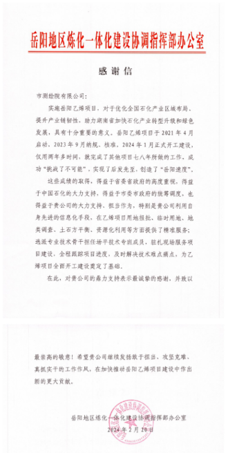 春风送暖,踏歌而行—— 一封来自岳阳地区炼化一体化建设协调指挥部的感谢信
