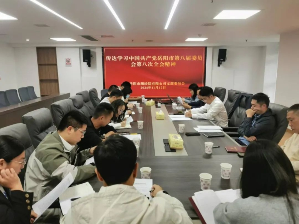 11月12日下午,岳阳市测绘院有限公司召开支部会议,传达学习市委第八届八次全会精神,研究落实举措,部署后阶段工作,支部书记、董事长郑君主持并讲话,公司全体党员、干部参会。