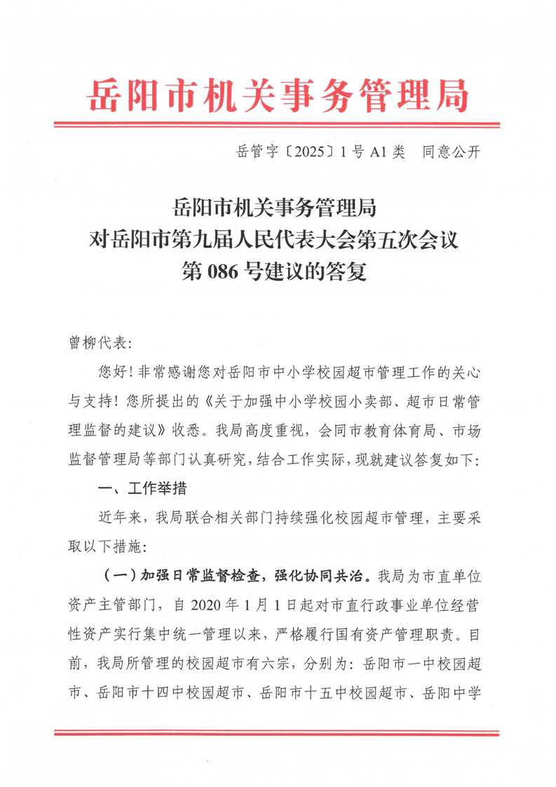 岳阳市机关事务管理局对岳阳市第九届人民代表大会第五次会议第086号建议的答复