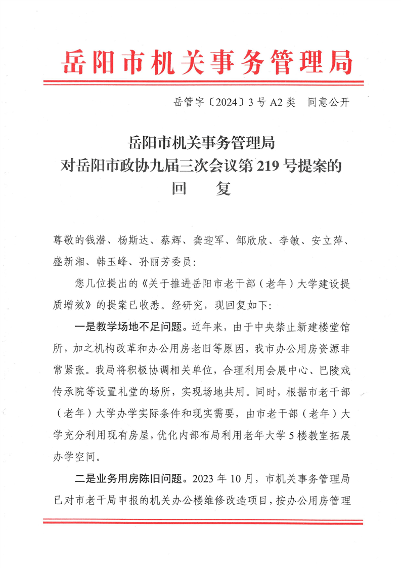 岳管字〔2024〕3号 岳阳市机关事务管理局对岳阳市政协九届三次会议第219号提案的回复