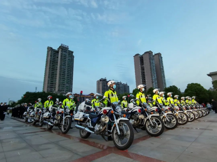 誓师大会现场,200名民辅警队伍组成的方队整齐划一、英姿勃发,40辆摩托车组成的骑警方队斗志昂扬、蓄势待发,6辆警车组成的警车方队的电子屏显示主题鲜明夺目、扮靓整个广场。