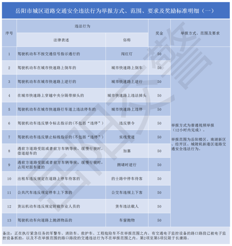 1.有奖举报方式仅限于视频举报,分普通视频举报和紧急报警举报两类。普通视频举报时间与违法发生时间间隔不得超过12小时,视频报警举报须在5分钟之内上传。紧急报警举报限法定工作时间受理。举报方式、举报范围和奖励标准有相应要求(详见附表)。