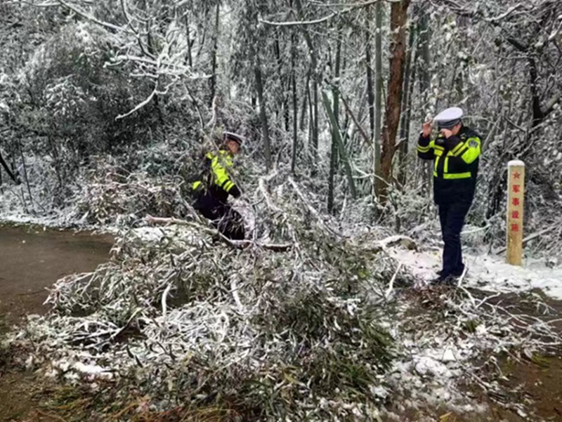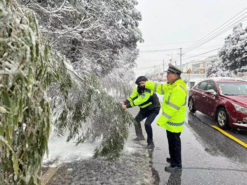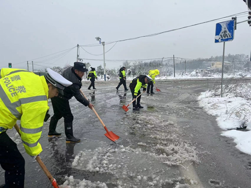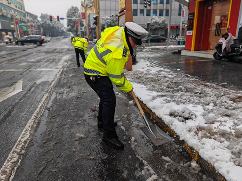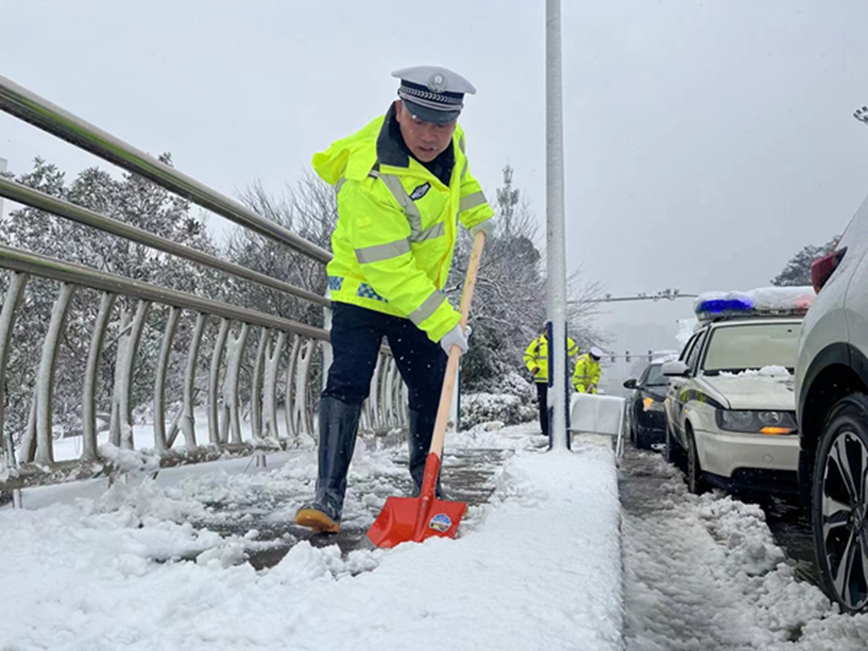 1月22日清晨,交警城区中队全警出动,来到城区、红花大桥等各大桥梁铲雪扫雪、清理路面;交警屈子祠中队到汨罗江大桥铲雪除冰;交警罗江中队对辖区十古公路清理被积雪压倒在道路边的树木;交警长乐中队清理桥面积雪及抬走倒塌的路灯杆等等,送雪夜中迷路的老人回家,推车轮打滑的小货车上坡,汨罗交警“暖心”守护模式持续开启,用责任和担当守护万家平安,成为风雪中最美的“雪警”。