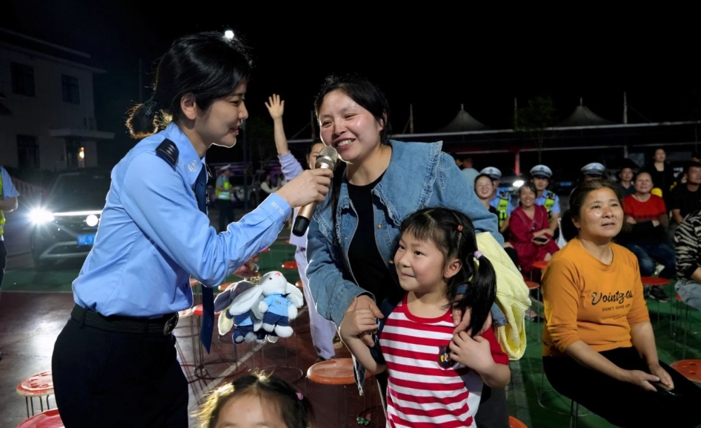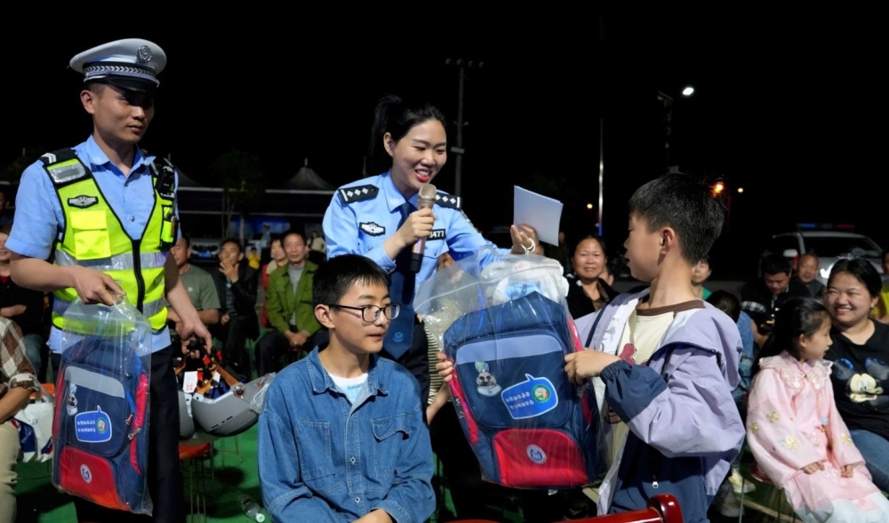 在交通安全常识有奖问答环节,现场气氛十分热烈,村民和学生们纷纷抢答,获得了头盔、书包、小玩具等各种奖励。