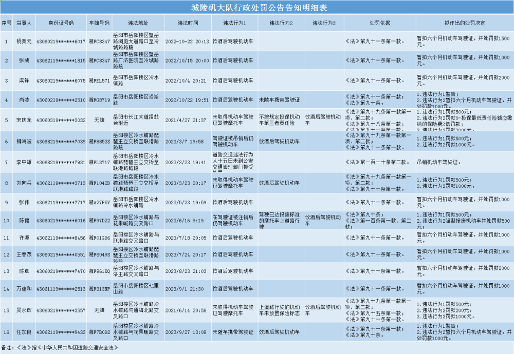 依据《中华人民共和国行政处罚法》第四十四条、《湖南省实施<中华人民共和国道路交通安全法>办法》第四十六条之规定,现依法公告告知如下:
