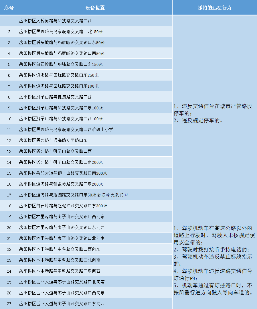 为进一步加强道路交通安全管理,预防道路交通事故,营造安全、有序、畅通的道路交通环境,依据《中华人民共和国道路交通安全法》《湖南省实施<中华人民共和国道路交通安全法>办法》等法律法规,在岳阳市城区增设一批交通技术监控(交通违法取证)设备,现依法予以公告。