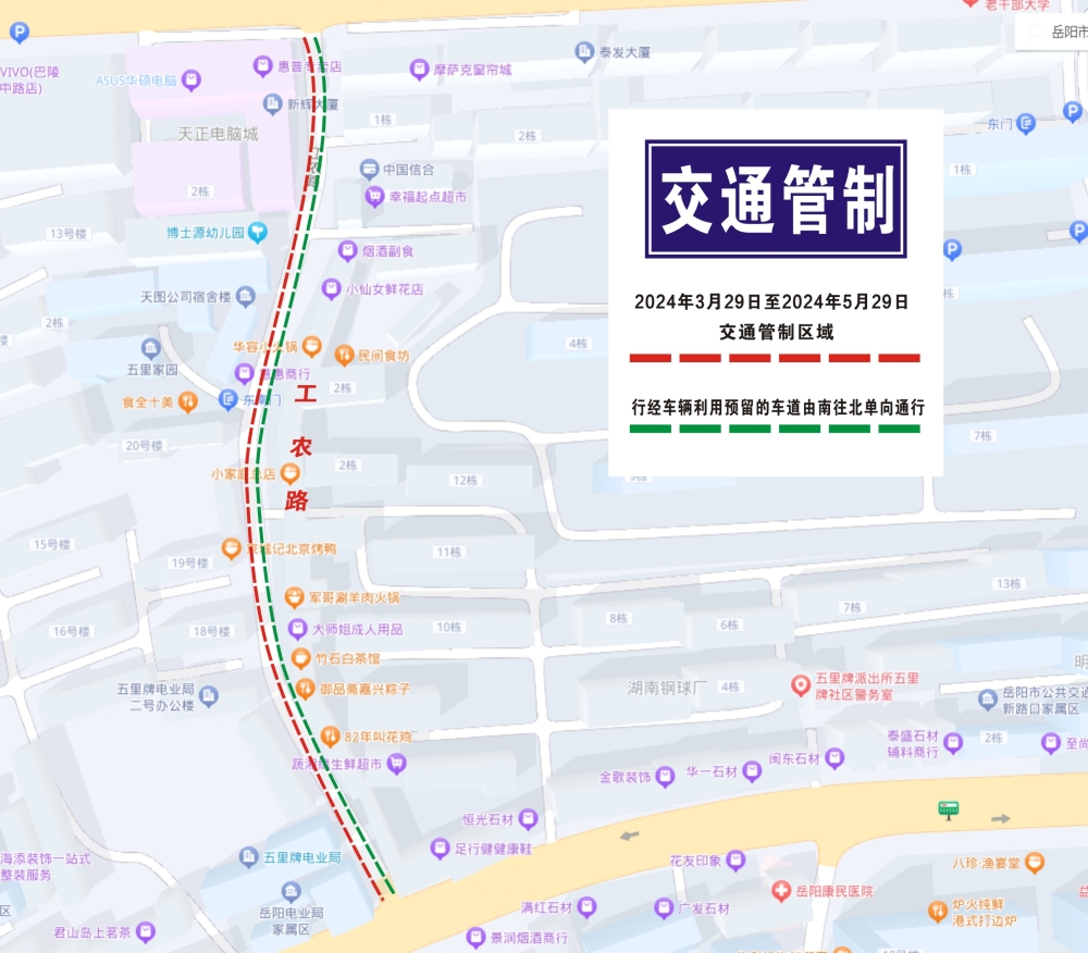 为确保工农路提质改造工程的顺利进行和施工期间道路交通安全,依据《中华人民共和国道路交通安全法》《湖南省实施〈中华人民共和国道路交通安全法〉办法》有关规定,决定对相关路段实行交通管制。