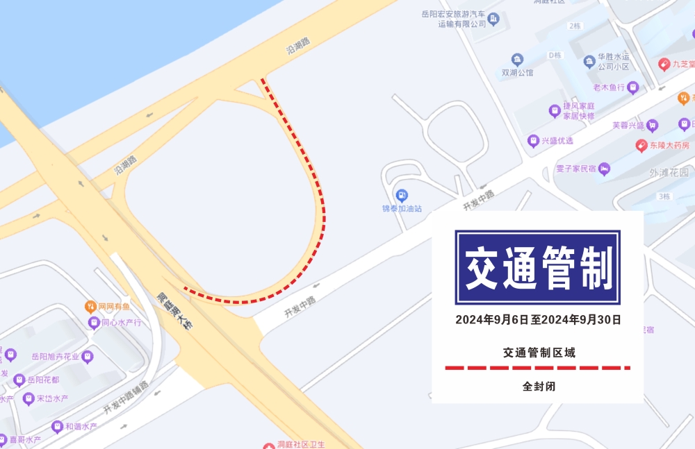 交通管制期间,管制路段采取全封闭状态施工。沿湖路前往君山方向的车辆须经桥下辅道、洞庭大道绕行。