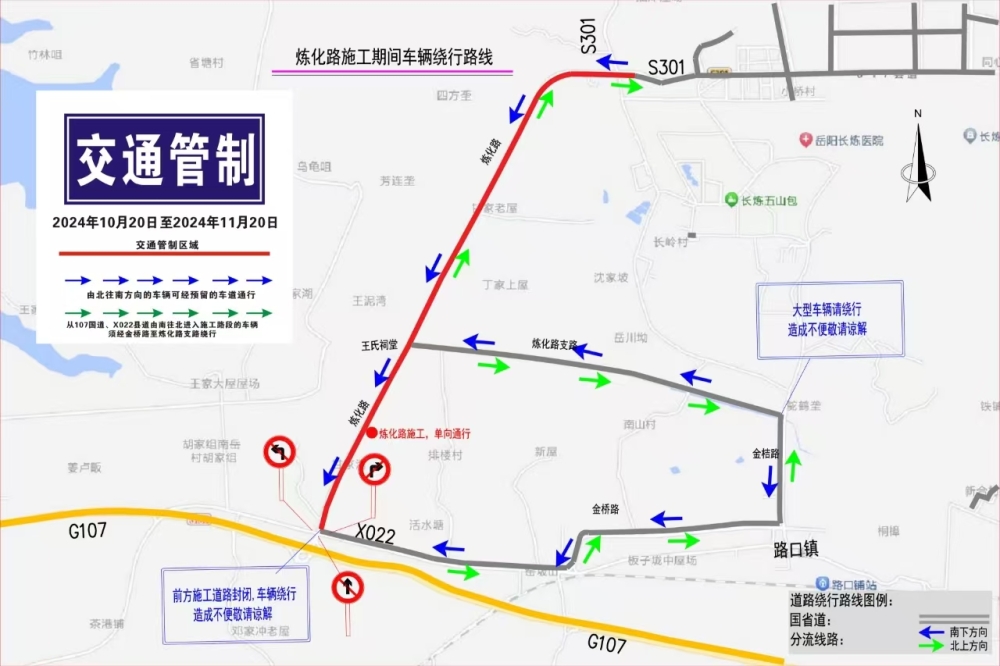 采取封闭半幅车道组织实施,交通管制期间,行经施工路段由北往南方向的车辆可经预留的车道通行,从107国道、X022县道由南往北进入施工路段的车辆须经金桥路至炼化路支路绕行。