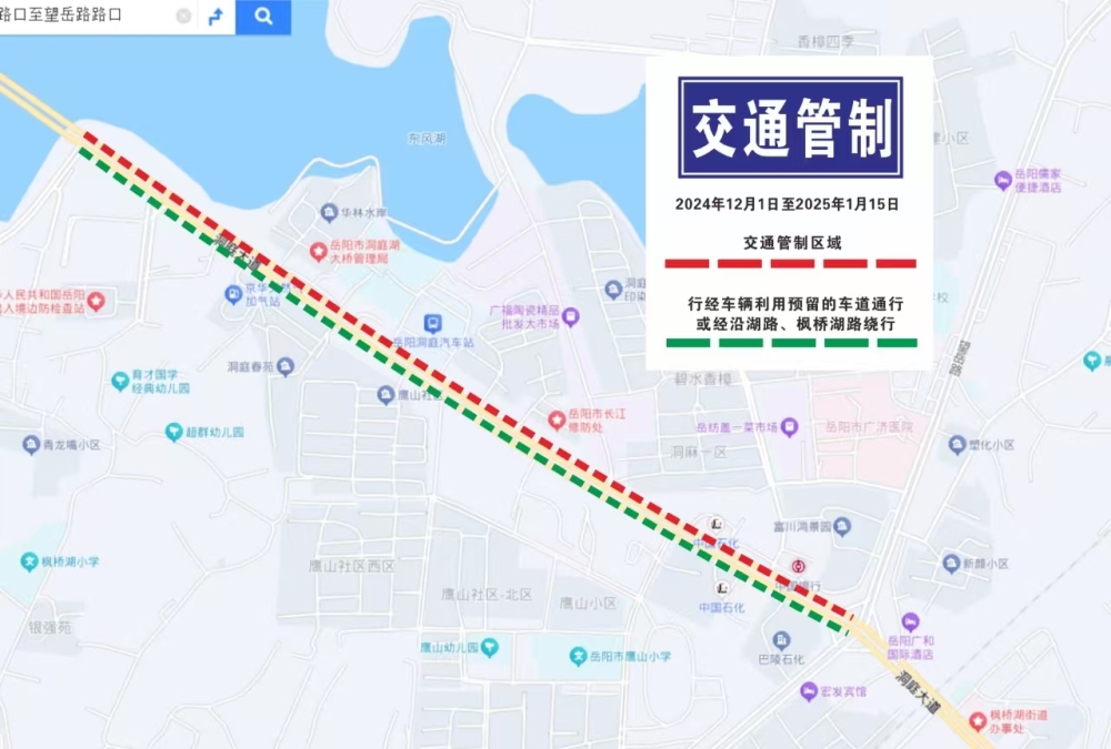 洞庭大道湖东路路口至望岳路路口路段。