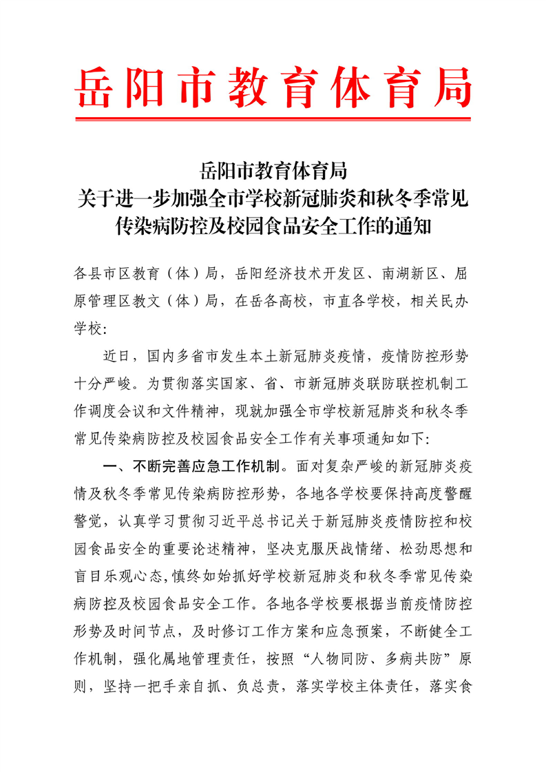 关于进一步加强全市学校新冠肺炎和秋冬季常见传染病防控及校园食品安全工作的通知