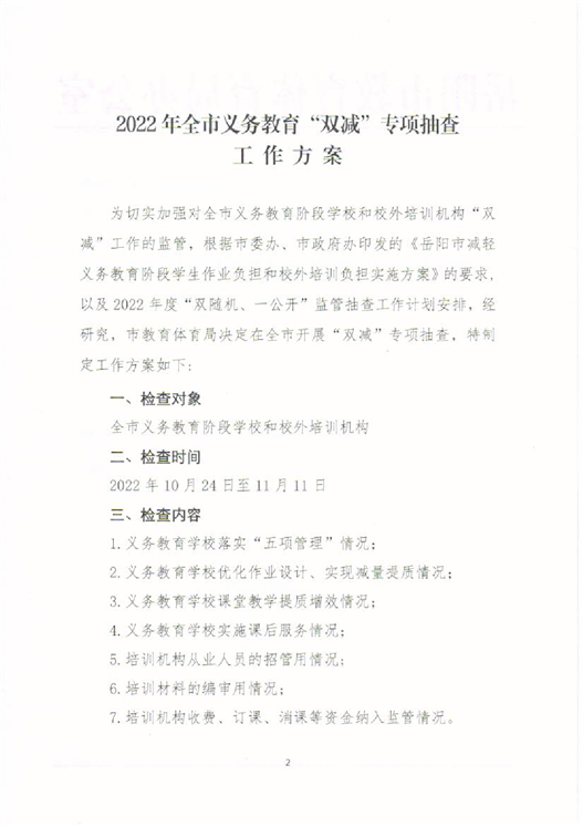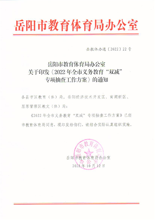 岳阳市教育体育局办公室关于印发《2022年全市义务教育“双减”专项抽查工作方案》的通知