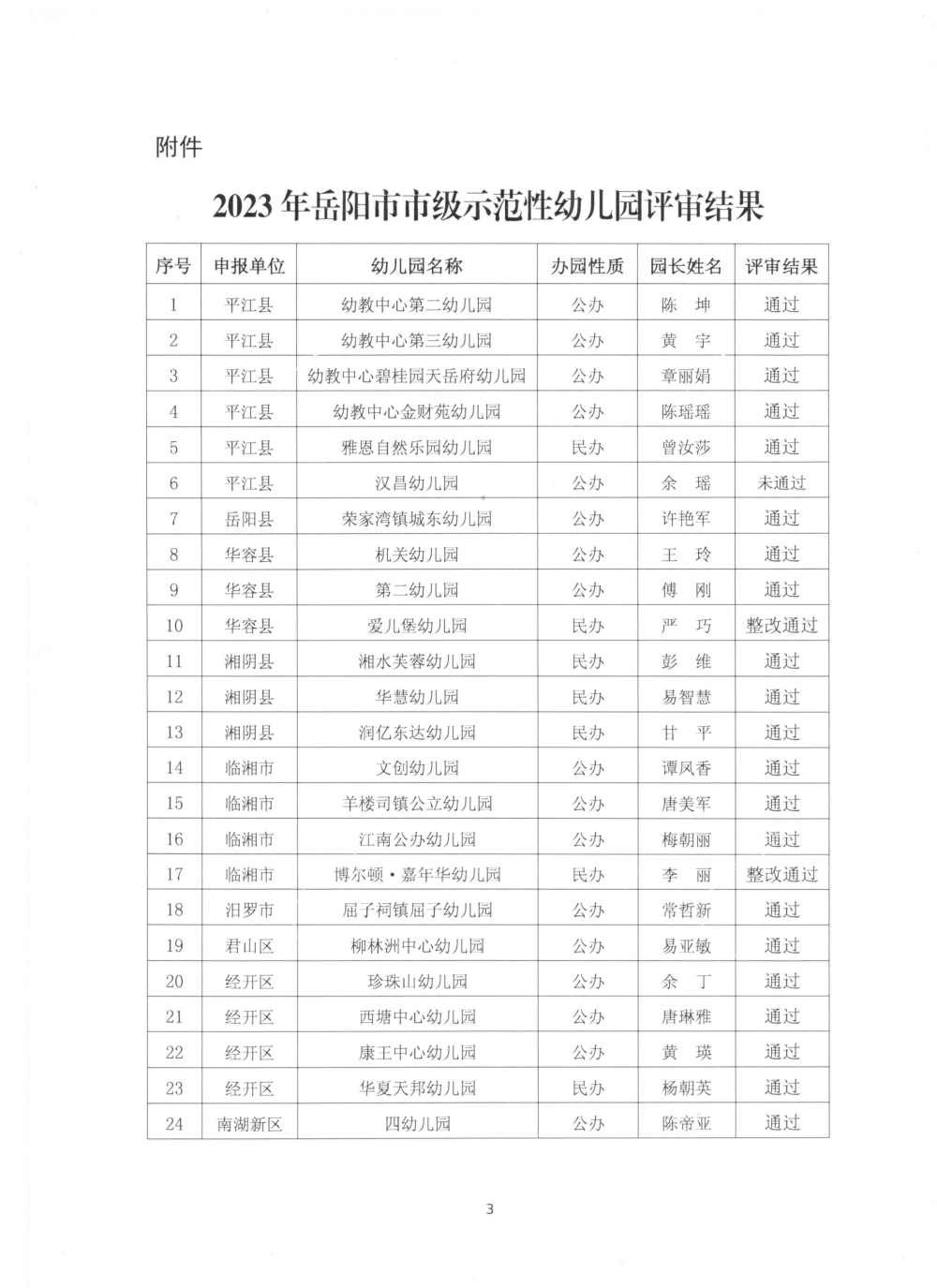岳阳市教育体育局关于2023年度市级示范性幼儿园评估结果的通报(岳教体通〔2023〕71号)