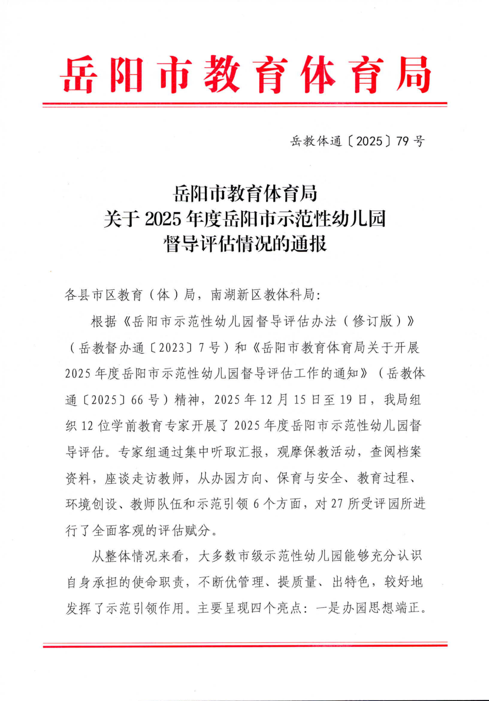 关于2025年度岳阳市示范性幼儿园督导评估情况的通报(岳教体通〔2025〕79号)