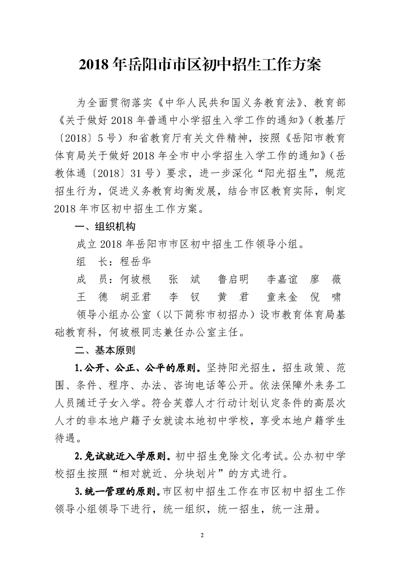 岳阳市教育体育局办公室关于印发2018年岳阳市市区初中招生工作方案的通知 岳教体办通[2018]45号