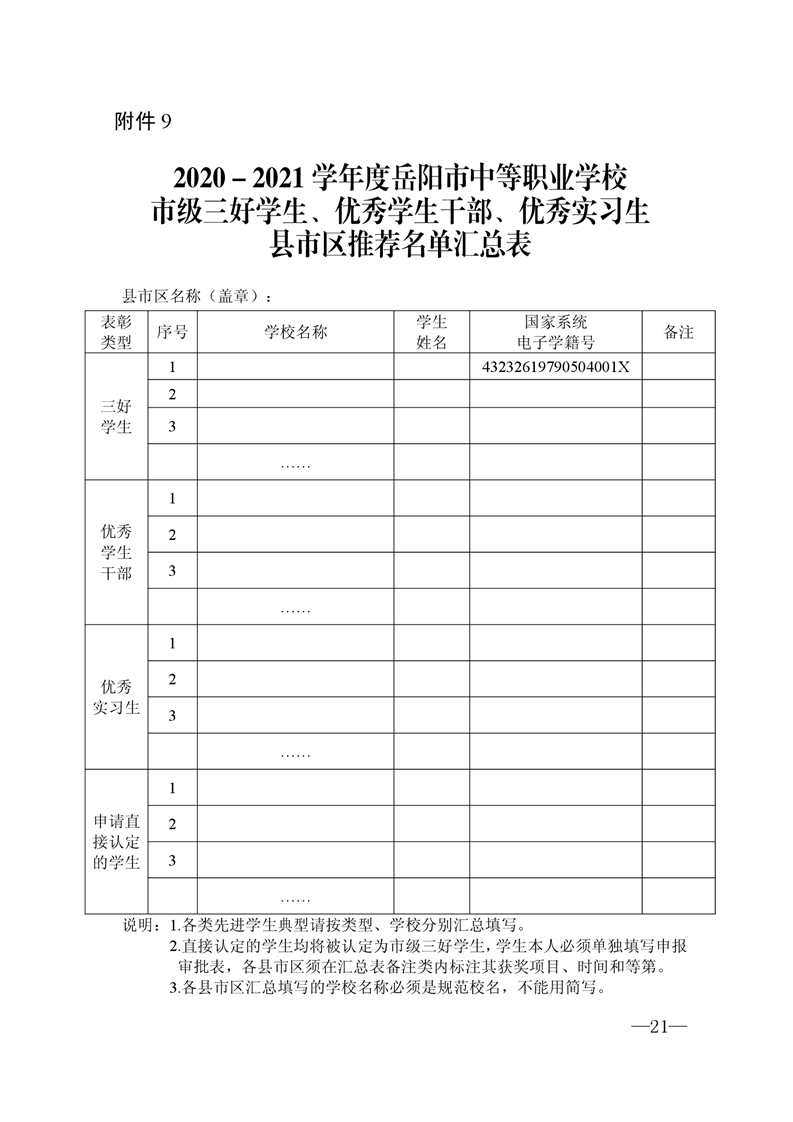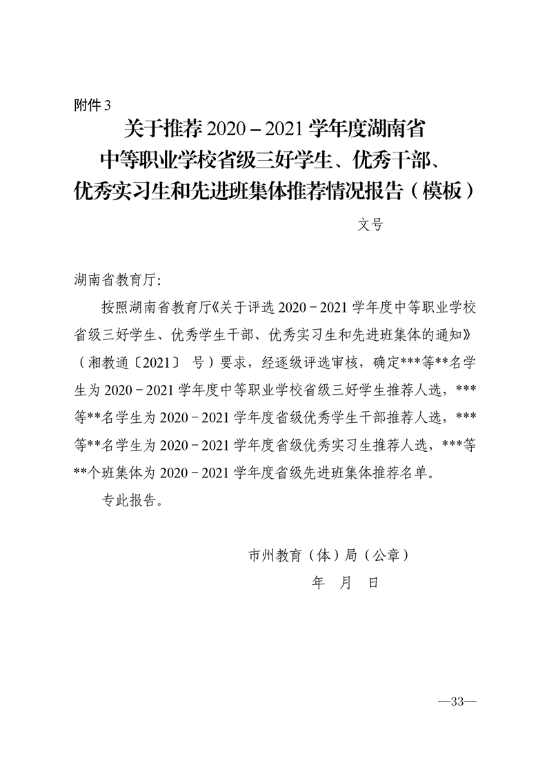 岳阳市教育体育局关于评选2020-2021学年度全市中等职业学校市级三好学生、优秀学生干部、优秀实习生和先进班集体暨推荐评选2020-2021学年度省级三好学生、优秀学生干部、优秀实习生和先进班集体的通知(岳教体通〔2021〕18号)