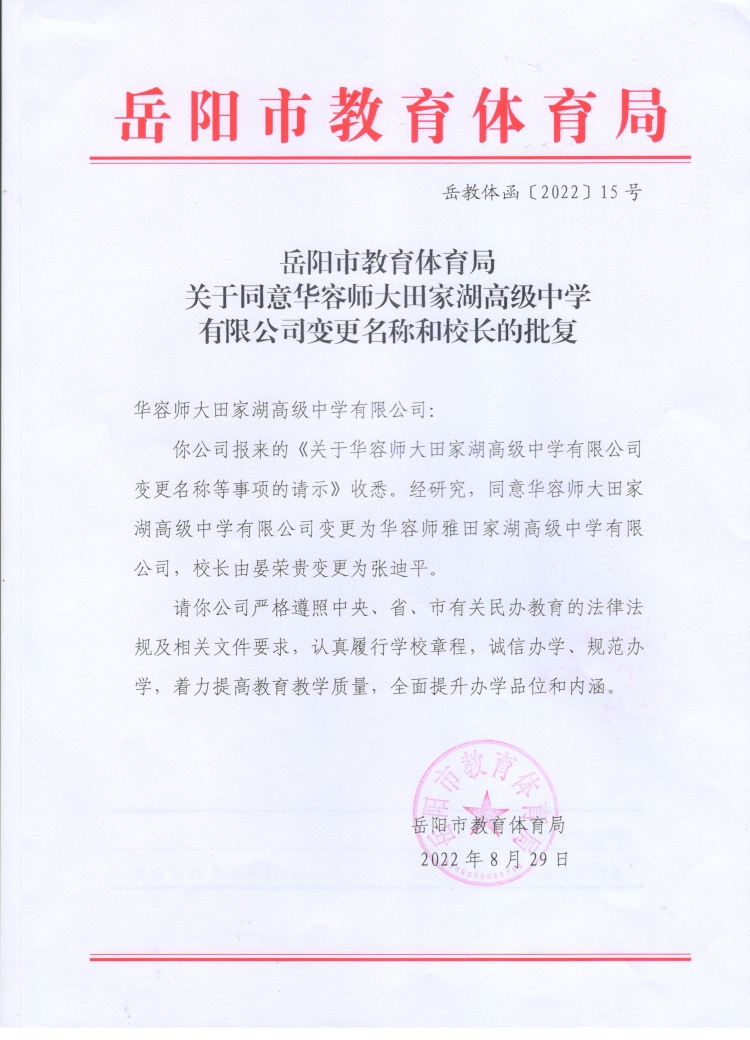 关于同意华容师大田家湖高级中学有限公司变更名称和校长的批复