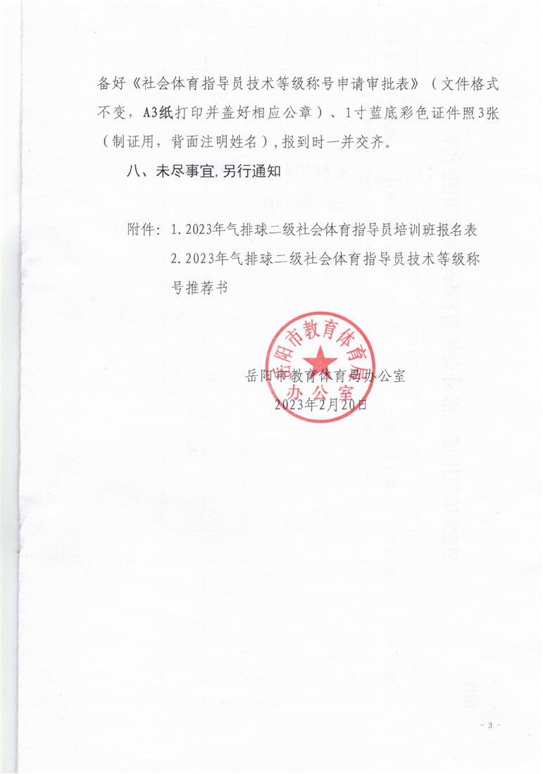 岳阳市教育体育局办公室关于举办 2023 年气排球二级社会体育指导员培训班的通知