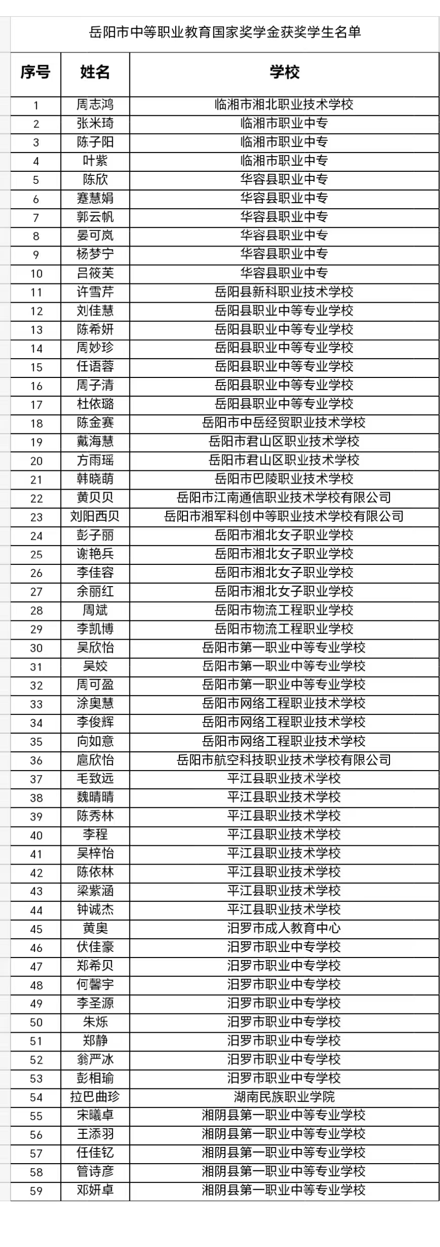 附岳阳市2024-2025学年度中等职业教育国家奖学金名单: