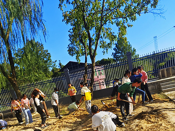 捋畦细作整,新土溢芳鲜。全体学生以班为单位,拿着各自准备好的锄头、铁耙、水桶等劳动工具,分成若干个互助小组,在班主任和指导老师的组织、示范下,到达本班的“责任地”开始学习种植蔬菜。劳动现场热火朝天而又井然有序,师生们既分工协作又互助配合,负责拔草的学生弯腰俯身,双手左右开弓,土地上的杂草很快一拔而光。负责翻土的学生则采取轮流作业的方式,按照指导老师“深挖轻翻、锄锄递进”的具体要求,奋力抡锄翻新一块块土地。负责平整土地的学生紧跟其后,用铁耙整平泥土,力求达到“沟深、垄直、土细”的基本标准。“躬耕劳形”的户外新课堂,使孩子们“锄”艺见长,劳动乐趣倍增。