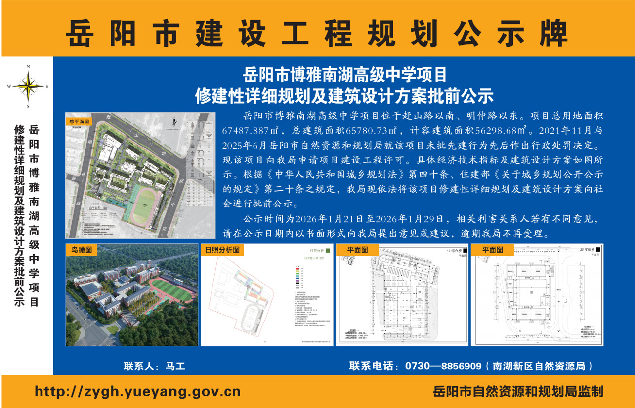 岳阳市博雅南湖高级中学项目修建性详细规划及建筑设计方案批前公示