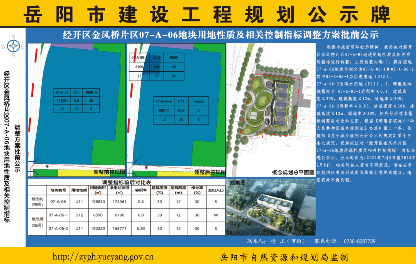 岳阳市八字门片区07-G-01地块用地性质和控制指标调整方案公示牌