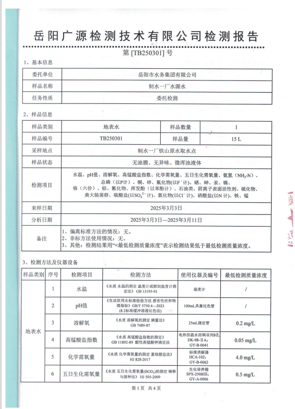 2025年10月岳阳市水务集团水源水水质检测月报表