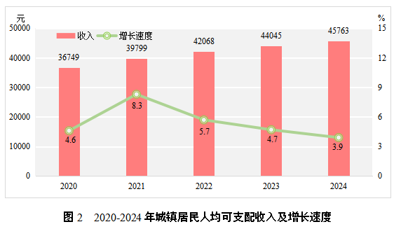 全年居民人均可支配收入36836元,比上年增长4.6%。其中城镇居民人均可支配收入45763元,增长3.9%;农村居民人均可支配收入24522元,增长5.8%。全市居民人均消费支出26912元,比上年增长4.9%。其中城镇居民人均消费支出30923元,增长5.0%;农村居民人均消费支出21379元,增长4.3%。
