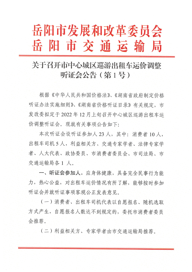 关于召开市中心城区巡游出租车运价调整听证会公告(第1号)