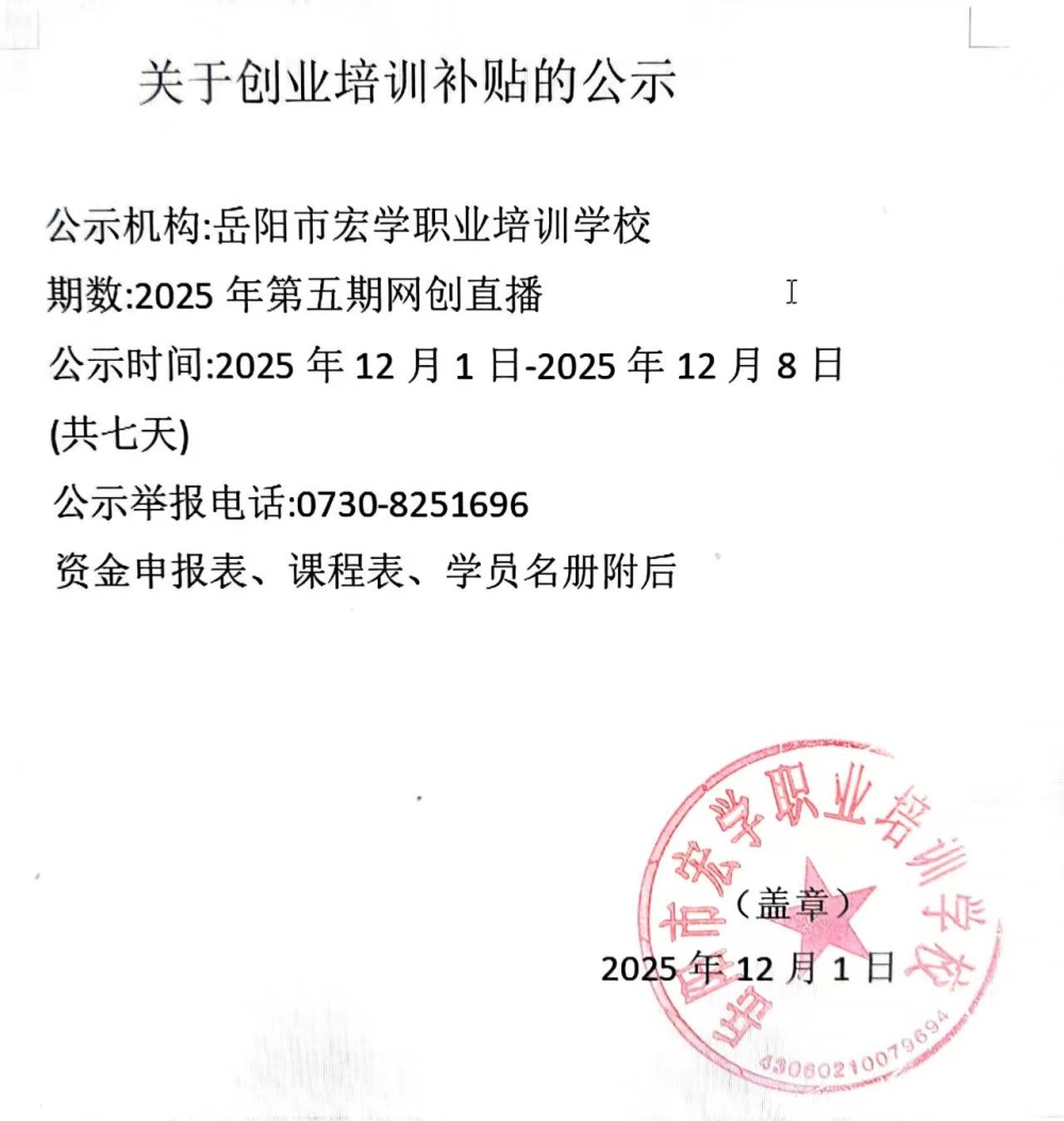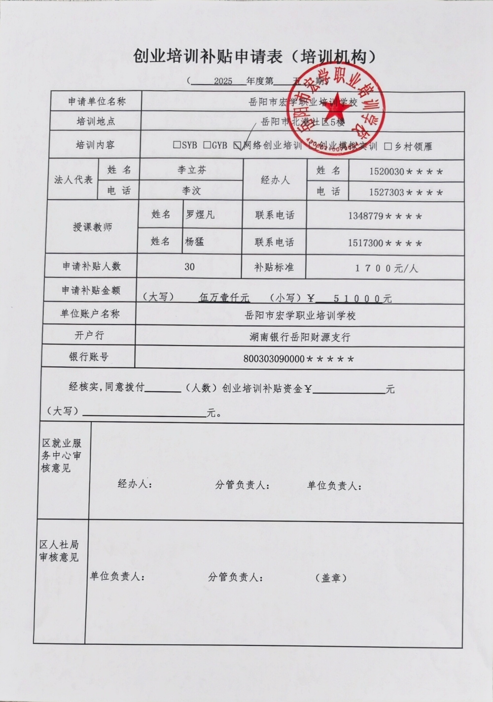 岳阳市宏学职业培训学校2025年第五期网络创业培训资金申请表、课程表、学员名册